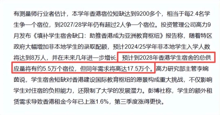到2027年,香港的学生寝室床位瞻望将增多到5.5万张,但本质需求高达17.2万张。这意味着,将有近12万名学生濒临“一床难求”的逆境。