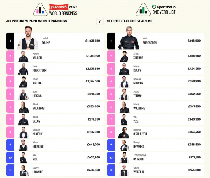 最新的单赛季排行,赵心童仍居赛季第二,罗伯逊赛季第一。