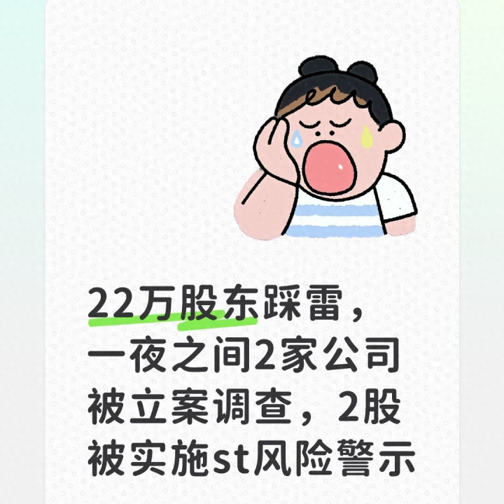 A股市集从来不缺让东说念主猝不足防的风险,而最近一次聚首爆发的利空,再一次让数万庸碌投资者感受到了市集的焦急。就在一个庸碌的往未来收盘后,成本市集遽然传来重磅音信:今夜之间,两家上市公司被监管部门稳健立案访问,另有两只股票被平直实施ST风险警示。