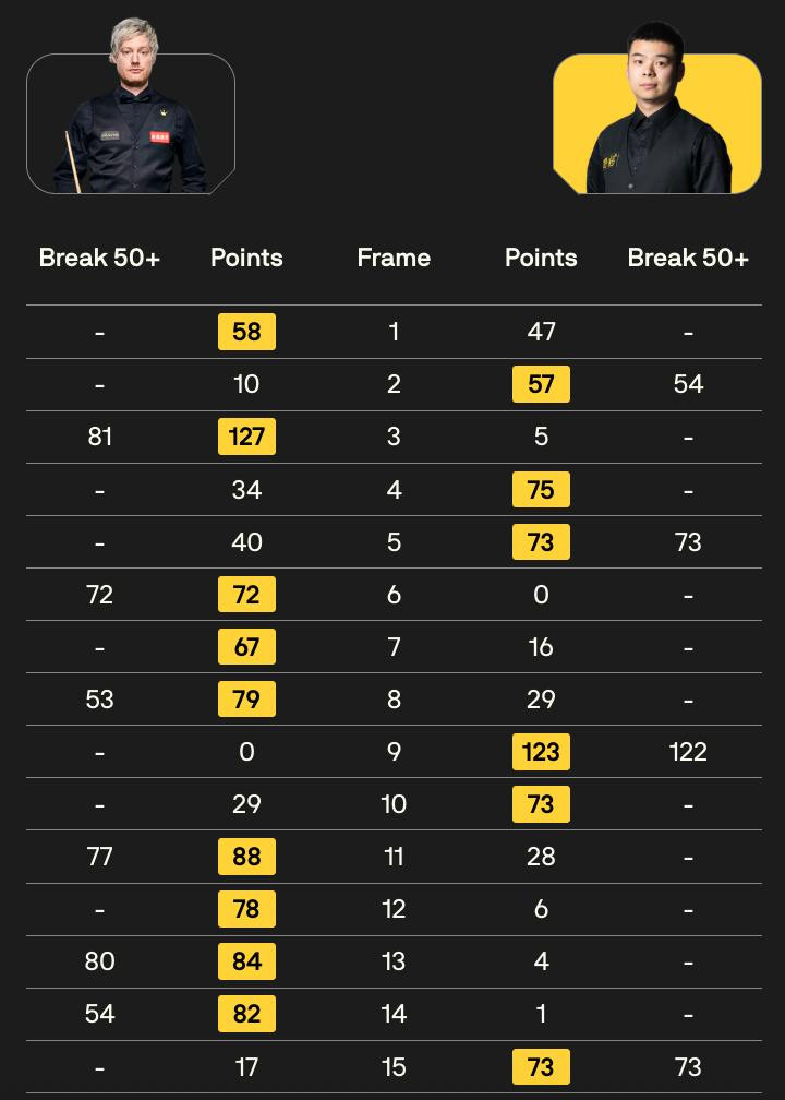 第13局,尼尔.罗伯逊轰出单杆80分赢下该局,开云体育官方网站大比分8-5暂时朝上。第14局,尼尔.罗伯逊最初上手得23分进军中断,缠斗中再次得到上手契机,打出单杆54分,以82:1拿下该局,大比分9-5最初取得赛点。第15局,庞俊旭凭借单杆73分辅助一赛点。