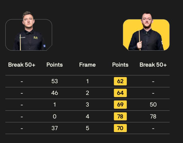 第一局,凯伦.威尔逊两次上手得分,最初取得53分朝上上风,此时球形相比复杂,多颗红球都是在库边。马克.艾伦上手得到17分后转属目,随后两东谈主进行了长技艺缠斗,临了马克.艾伦上手打进粉球,以62:53完竣单局逆转。第二局,马克.艾伦凭借属目上风两次上手得18分,进军谬误留给凯伦.威尔逊上手契机,凯伦.威尔逊上手打出单杆46分交出球权,马克.艾伦第三次上手得分完竣超分,以64:46再下一局。