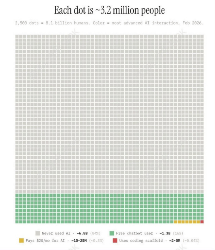并吞时期,笔据Data Reportal的一份统计评释骄贵,寰宇上有68亿东说念主——很是于全球东说念主口的84%——从未使用过任何AI把握,能为AI付费的用户,更是只占到戋戋0.3%,即是这样寒酸。