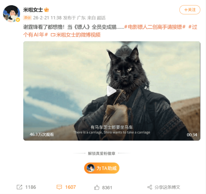 国士待之,国士报之,「镖东说念主」的大方,引发了陆续袒露的二创盛筵,为影片的宣发赚足了群众基础,而全员变猫的爆款AI视频,更是圈进来了一大波路东说念主粉。