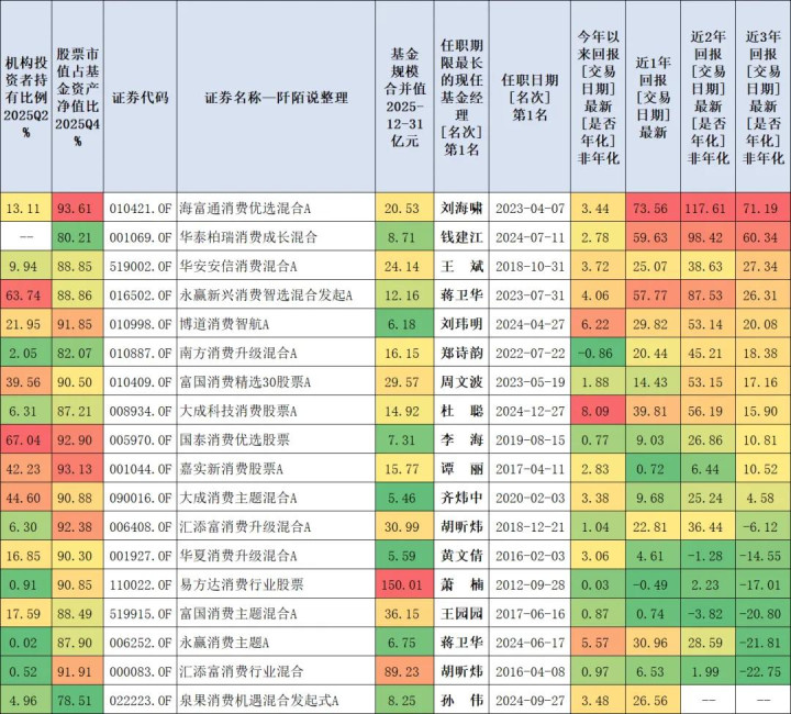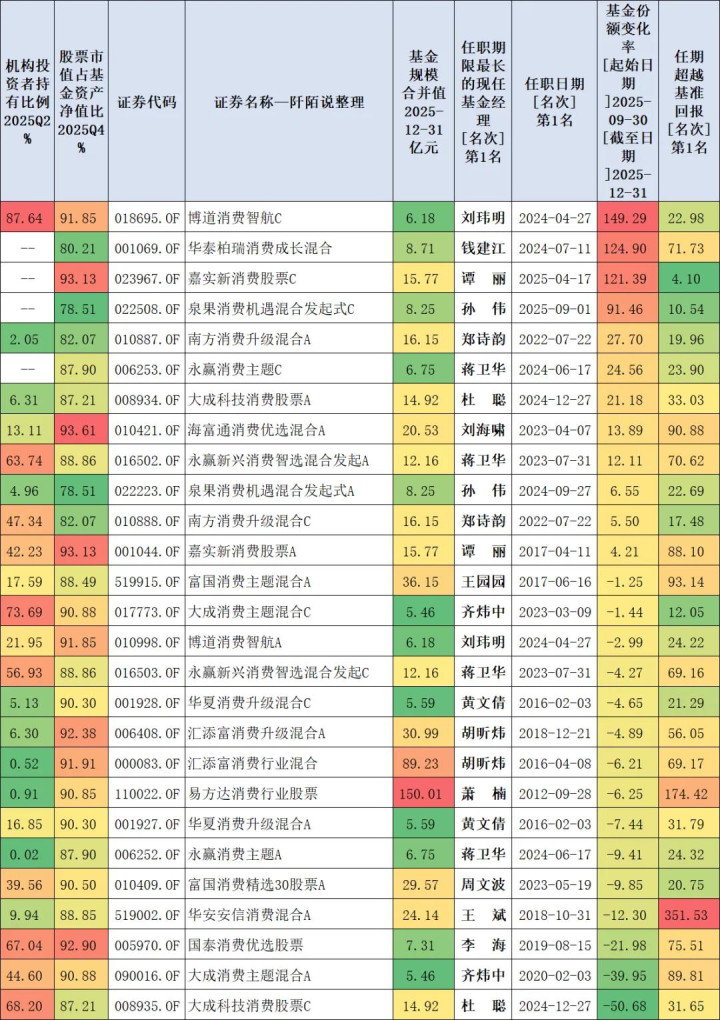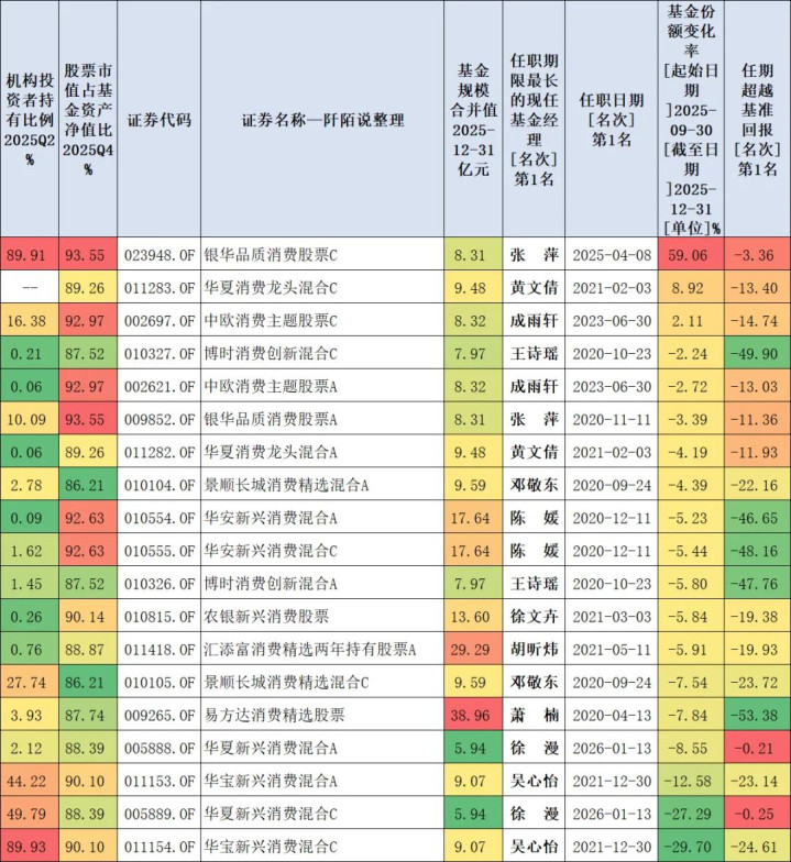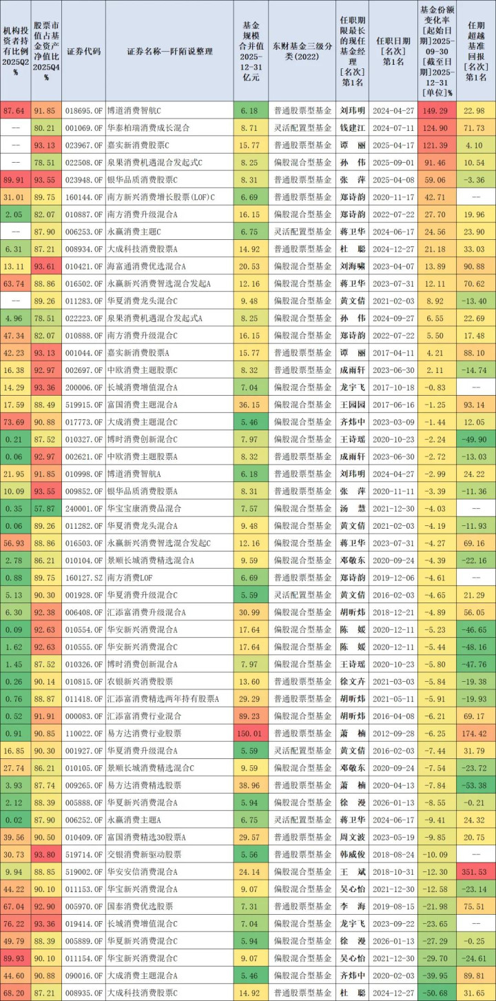 众人都知谈当今耗尽在低位,咱们来望望2025年四季度基民对现时商场上耗尽基金(司理)的一些立场——条款基金称呼中有“耗尽”两个字,2025Q4限制合并值大于5亿元,筛选出炉一些基金,我底下展示一下数据。