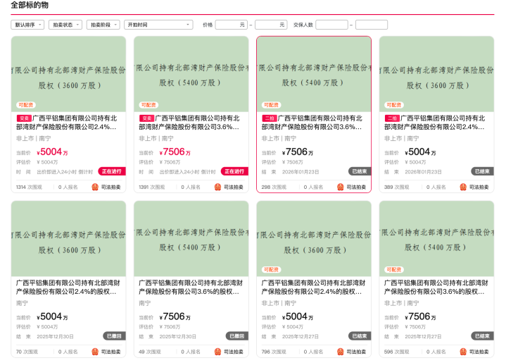 此前,上述两笔股权曾分别于2025年12月27日、2026年1月22日两次登上拍卖台,开云app均以0东谈主报名、无东谈主出价完毕。据悉,该笔拍卖源于广西平铝集团触及的一桩协议纠纷案,因需璧还3.55亿元债务,其所捏北部湾财险股权被列为实行想法。