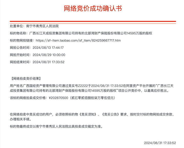值得注重的是,本次广投金控受让的长江天成所捏北部湾财险1.4595亿股股权(占总股本9.73%),曾于2024年3月、5月两次登上拍卖台。在历经两次流拍后,于2024年8月在变卖次序,由广西国经钞票科罚有限公司以2.03亿元竞得,但该笔往来于今未获监管批准。