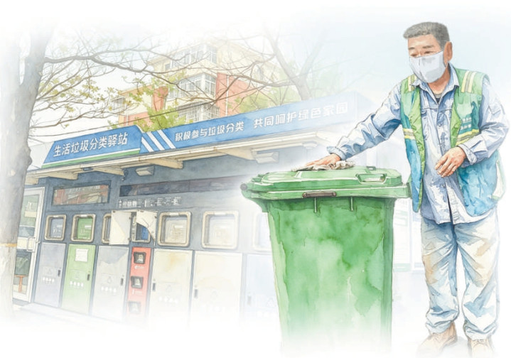 经过一整宿,居民送达到驿站里的垃圾堆得像小山,垃圾桶爆满,部分垃圾就滑落到地上。夏日高温,垃圾不足时清运就会发酵出异味。老谭把每个垃圾袋重新开放,按要求把垃圾折柳装入其他垃圾、厨余垃圾、无益垃圾桶。他抹了把额头的汗水,拎来一桶水,用毛巾蘸着水把每个垃圾桶擦干净。一阵忙绿,一转擦亮了装满垃圾的桶,就像老谭的兵排队站在路边,恭候7点钟的垃圾车来运走。