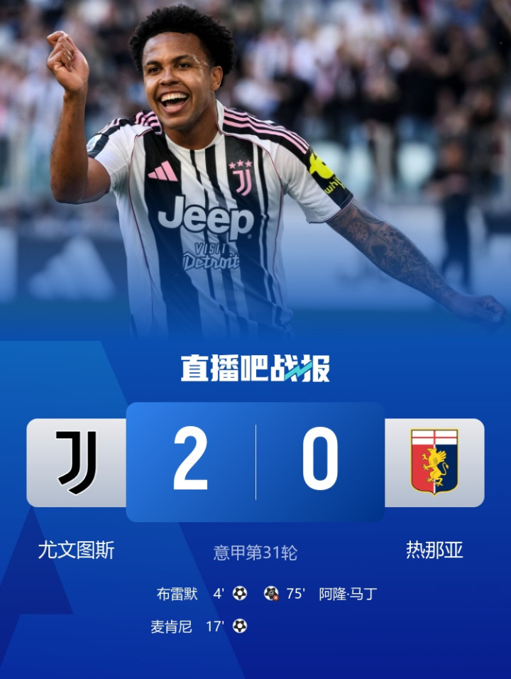直播吧4月7日讯北京本事0:00,意甲第31轮尤文图斯vs热那亚,比赛在都灵安联球场打响!上半场,尤文连系3东说念主头球接力,布雷默破门;麦肯尼反击立功,随后门前1米错失佛门良机!下半场,麦肯尼再失良机,戴维中柱;布雷默送点,迪格雷戈里奥勇猛扑点!最终,尤文主场2-0打败热那亚,意甲5轮不败,距离前四仅1分。