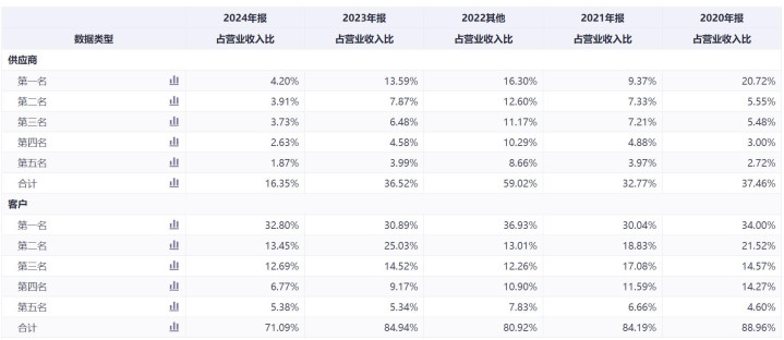 招股书透露,公司前五大客户孝敬收入占比持久督察在七成以上,即便2024年出现回落,依旧高达71.20%。捷捷微电、斯达半导、立昂微等少数几家行业龙头,决定了这家公司的营收命根子。